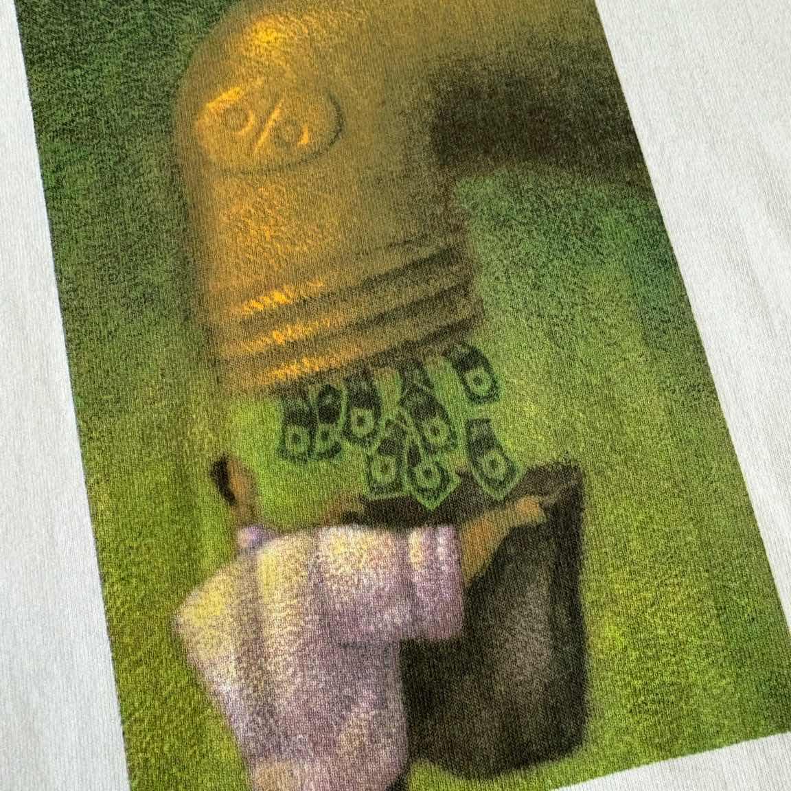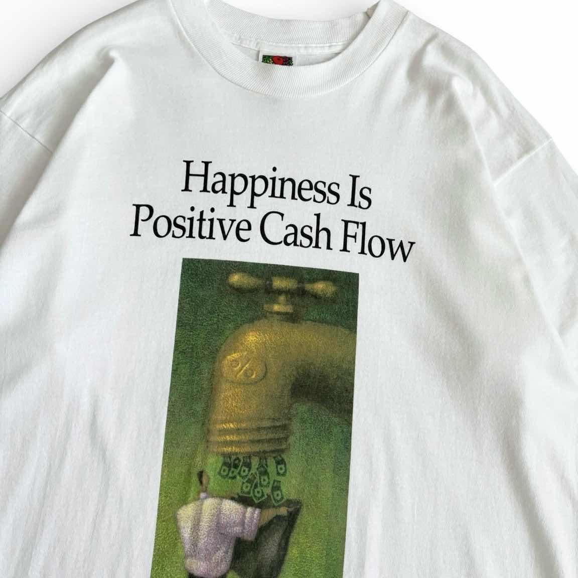 ○商品説明 FRUITOFTHELOOM デザイン良すぎる一枚。 Happiness Is Positive Cash Flow 幸福とは、プラスのキャッシュフローである 幸福という、ビジネスや金融分野での価値観を 表現したシンプルなメッセージ。 巨大な金色の蛇口からドル紙幣が流れ出すデザイン。 蛇口には「%」のマークがあり、金利や投資利益を 表現しています。 その下でサラリーマン風の人物が、スーツケースの ような入れ物で紙幣を受け取っている様子。 こんな夢のような蛇口一度でいいから 見てみたいですね。笑 気になった方は是非。 ○サイズ 表記L 平置き ・肩幅51cm ・身幅52cm ・袖丈22cm ・着丈72.5cm ○商品の状態 A A:使用感がほとんどなく、汚れやシミもなし B:多少使用感はあるが、汚れやシミも少ない C:使用感があり、汚れやシミがある D:使用感があり、大きな汚れや破れあり #FRUITOFTHELOOM#フルーツオブザルーム#企業#Tシャツ